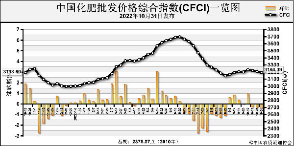 10月31日中國化肥批發價格綜合指數(CFCI)為3194.39點,環比下跌15.80點,跌幅為0.49%;同比下跌53.16點,跌幅為1.64%;比基期上漲815.55點,漲幅為34.28%。
